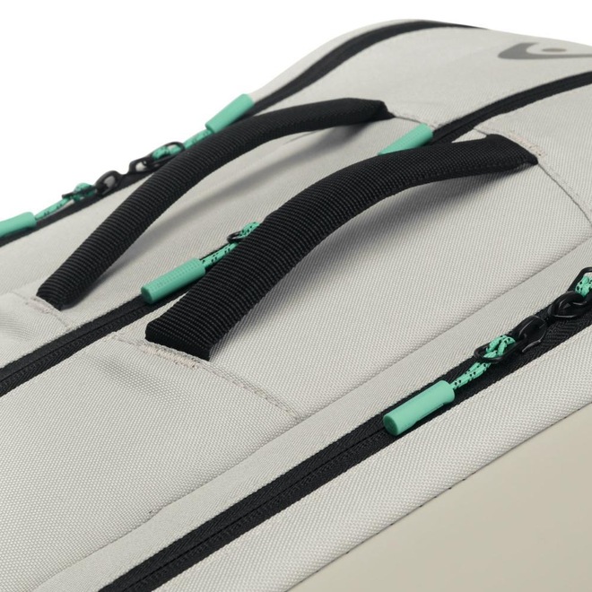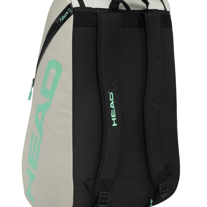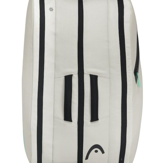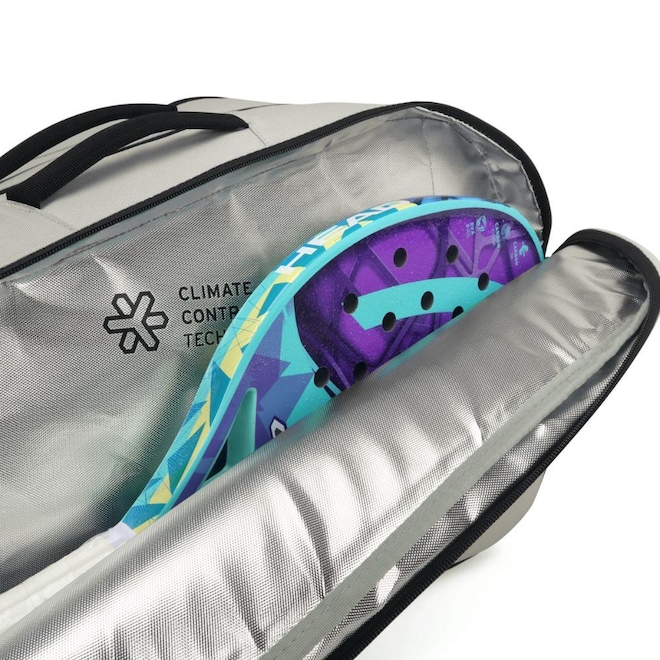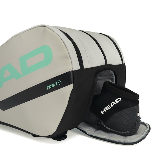 - Detalhamento: Raqueteira para raquetes de Beach Tennis ou Padel, capacidade para até 09 raquetes de beach tennis ou padel sem capa ou 7 raquetes de beach tennis ou padel com capa, possui três compartimentos com fechamento em zíper, em um deles possui um bolso interno em mesh, um dos compartimentos é térmico revestido com CCT, bolso externo em cada lateral, um bolso para acomodar peças úmidas ou um par de calçados, alça ajustável acolchoada com proteção para os ombros, alça reforçada de mão, marca Head estampada nas duas faces da raqueteira;