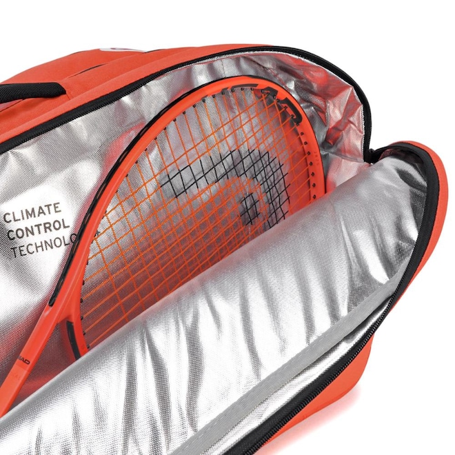 - Detalhamento: Três compartimentos com fechamento em zíper, sendo um deles térmico com tecnologia CCT+ que protege suas raquetes contra temperaturas extremas. Capacidade para até 12 raquetes sem capa. Conta ainda com compartimento integrado para calçados, bolso interno com zíper e bolso externo com zíper para acesso rápido. Alças acolchoadas e ajustáveis no estilo mochila, além de alça superior para transporte. Escrita Head em ambos os lados, com 75 litros de armazenamento;