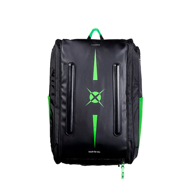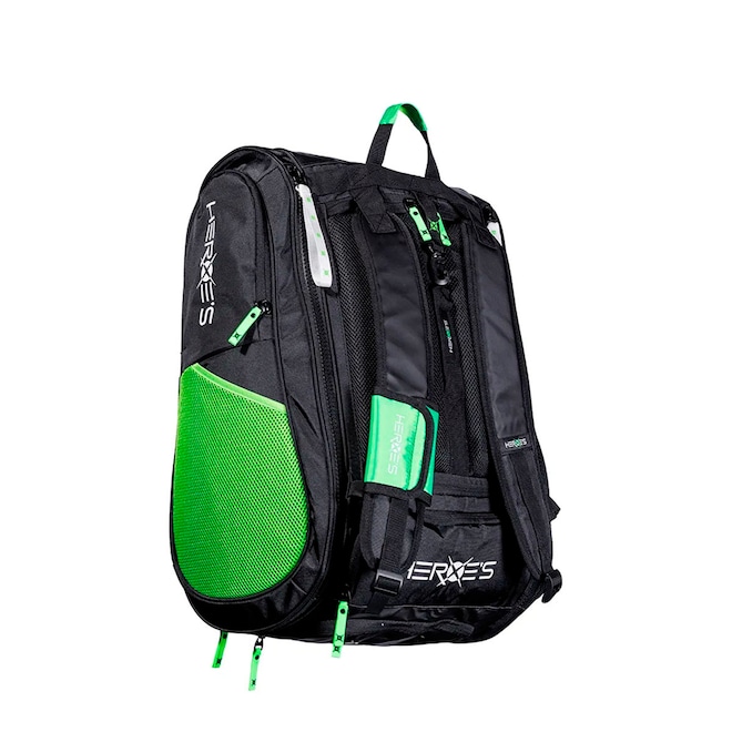 O design funcional da Raqueteira Heroe's Thunder Elettra 2025 inclui dois estojos laterais para raquetes, sendo um deles com proteção térmica. Além disso, ela possui um amplo compartimento central, oferecendo muito espaço para seus itens essenciais. Os dois bolsos laterais são perfeitos para armazenar acessórios, enquanto o bolso externo ventilado é ideal para guardar sapatos ou roupas usadas. Também há um bolso especial para três tubos de bolas.