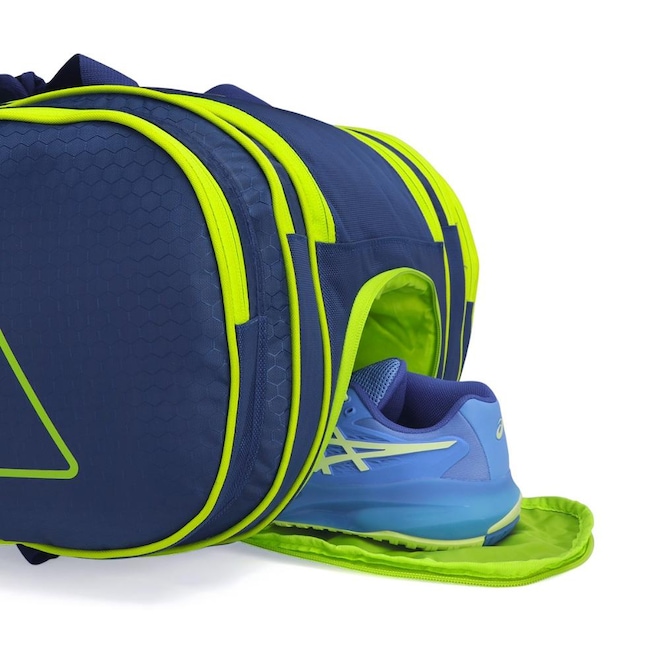 - Detalhamento: Raqueteira tripla com amplo espaço no compartimento principal, que conta com bolsos internos para organizar todos os seus itens. Dois compartimentos externos, com forro térmico em ambos os lados da bolsa, protegem suas raquetes contra temperaturas extremas, com capacidade para até 4 raquetes de Pickleball (duas em cada bolso). Dois bolsos adicionais nas laterais, com logo e escrita da marca, oferecem acesso rápido a itens menores. Na base, há um compartimento para acomodar um calçado. No topo, alça reforçada e gancho permitem prender a bolsa em qualquer lugar, inclusive sob o sol. Duas alças reguláveis possibilitam o transporte nos ombros, enquanto alças de mão proporcionam ainda mais versatilidade. Logo e escrita da marca estão presentes na parte frontal e nas alças, conferindo estilo e identidade à bolsa;