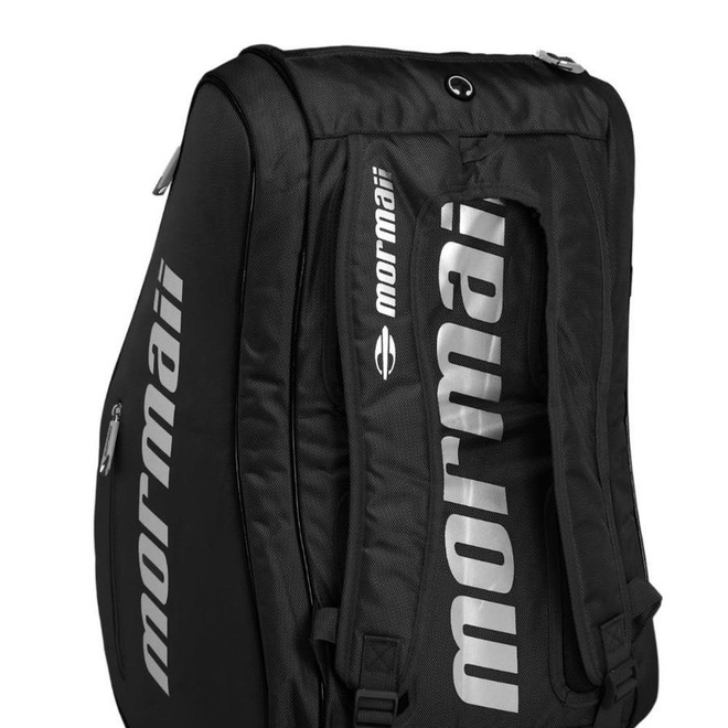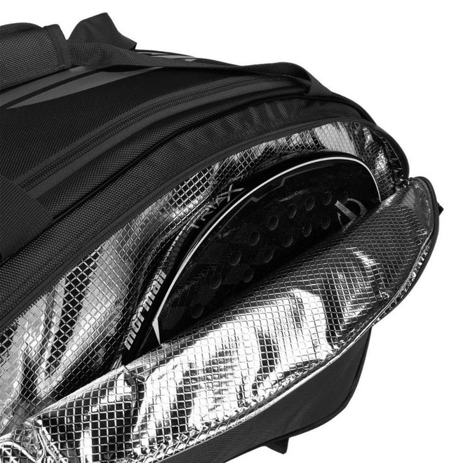 - Detalhamento: Capacidade de armazenar até 10 raquetes de Beach Tennis ou 07 de Padel (sem capa) em três compartimentos principais, sendo dois térmicos para proteger suas raquetes das variações de temperatura. Um bolso espaçoso para organizar roupas e sapatos, com tecido telado em ponto estratégico para melhor respirabilidade. Dois bolsos laterais para armazenar pequenos pertences e acessórios. Um bolso pequeno para celular que permite a saída de fone de ouvido, para você ouvir suas músicas favoritas enquanto se desloca. Todos os compartimentos possuem fechamento em zíper, para garantir a segurança dos seus itens. Alças ajustáveis e acolchoadas que permitem carregar a raqueteira como mochila, e uma alça de mão que auxilia na comodidade para transporte. Escrita Mormaii nas laterais em cor contrastante