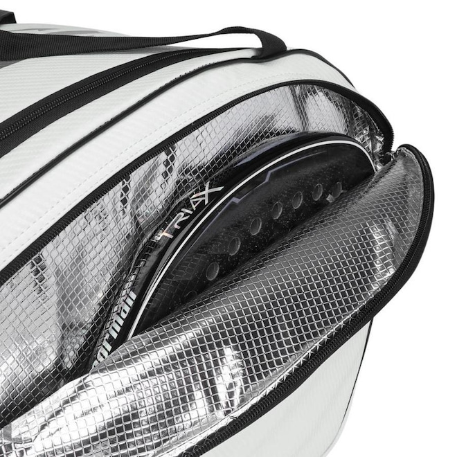 - Detalhamento: Capacidade de armazenar até 10 raquetes de Beach Tennis ou 07 de Padel (sem capa) em três compartimentos principais, sendo dois térmicos para proteger suas raquetes das variações de temperatura. Um bolso espaçoso para organizar roupas e sapatos, com tecido telado em ponto estratégico para melhor respirabilidade. Dois bolsos laterais para armazenar pequenos pertences e acessórios. Um bolso pequeno para celular que permite a saída de fone de ouvido, para você ouvir suas músicas favoritas enquanto se desloca. Todos os compartimentos possuem fechamento em zíper, para garantir a segurança dos seus itens. Alças ajustáveis e acolchoadas que permitem carregar a raqueteira como mochila, e uma alça de mão que auxilia na comodidade para transporte. Escrita Mormaii nas laterais em cor contrastante