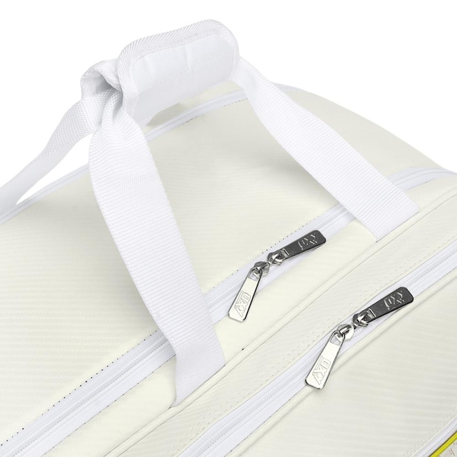 - Detalhamento: Compartimento principal amplo, com bolso interno com zíper e bolso telado para melhor organização dos objetos. Comporta até 8 raquetes de Beach Tennis ou 5 raquetes de Padel, ambas sem capa. Possui compartimento térmico que protege o equipamento contra variações de temperatura externa. Conta ainda com bolso frontal para itens de fácil acesso e bolso com respiro na parte inferior, ideal para calçado ou peças úmidas. Acompanha saco de nylon para calçados ou roupas. As alças de mão e as alças de ombro são ajustáveis e suavemente acolchoadas, garantindo mais conforto no transporte. A logo da marca está presente em ambas as laterais em destaque;