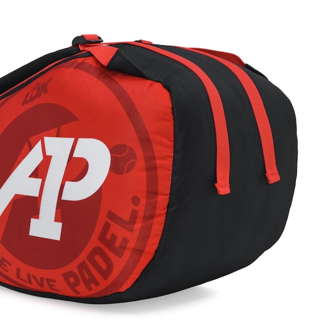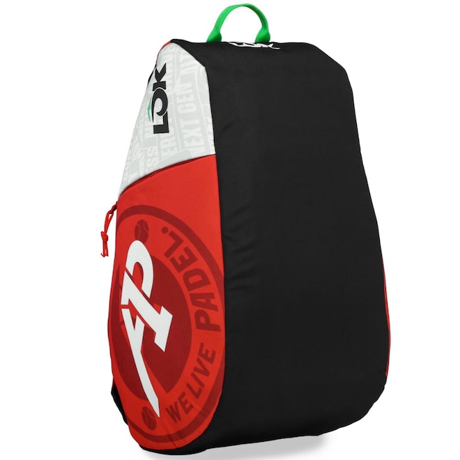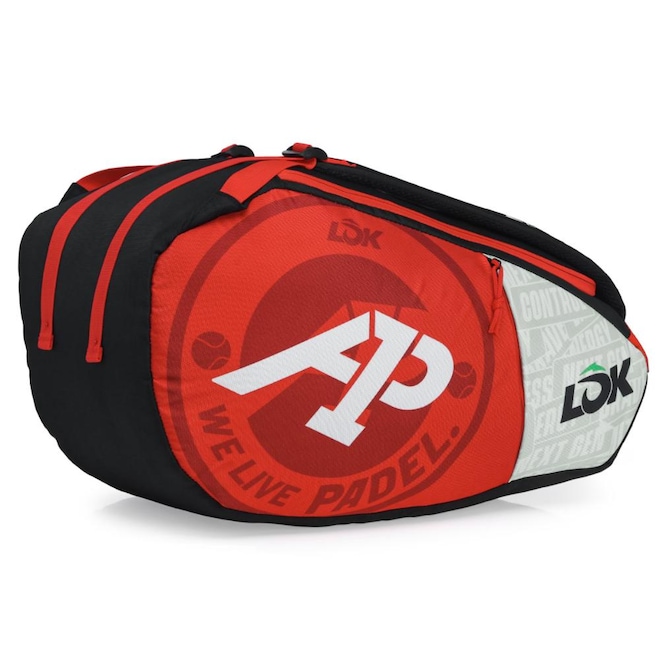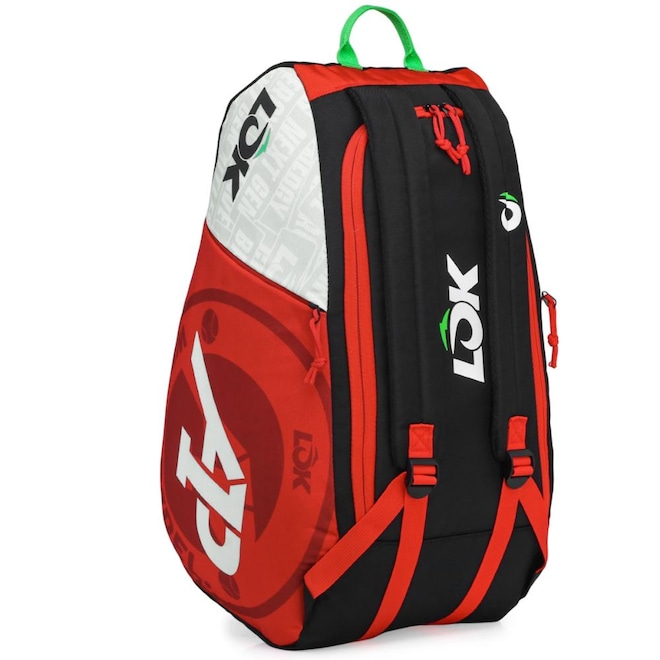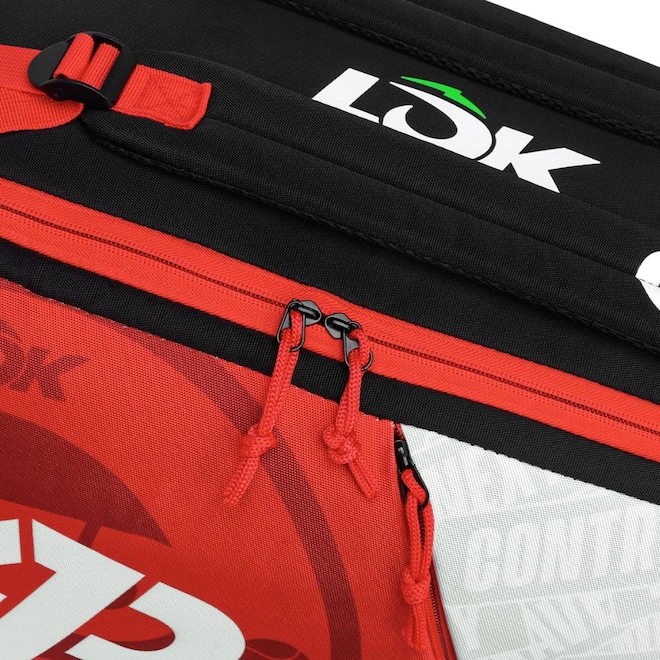 - Detalhamento: Possui um compartimento principal com duas divisórias laterais internas e um central espaçoso que acomodam juntos até 5 raquetes de Padel ou até 8 raquetes de Beach Tennis sem capas. Dois bolsos laterais externos para pequenos objetos. O design desta raqueteira combina dinamismo e identidade esportiva com um visual marcante em vermelho, branco e preto. O logotipo Lõk aparece em destaque. Os detalhes em verde dão um toque vibrante, completando uma estética moderna e competitiva. Todos os compartimentos possuem fechamento em zíper. Alças de ombros reguláveis acolchoados que permitem o transporte como mochila e alça superior para auxiliar na comodidade na hora do transporte;