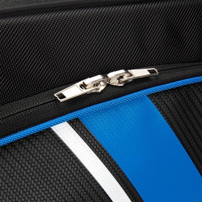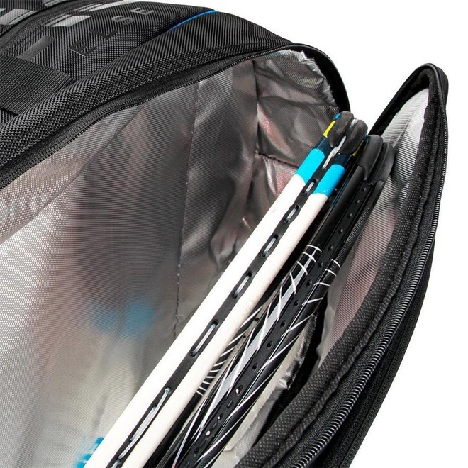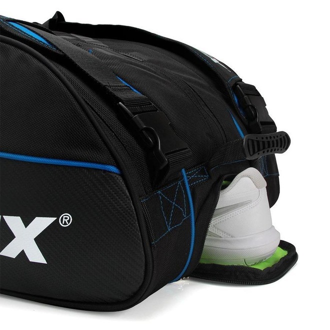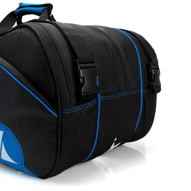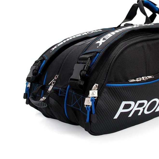 Conheça as características da Raqueteira Prokennex X12 2021 Preta e Azul - Perfil: Tênis - Material: Composto por Nylon e Poliéster - Detalhamento: Raqueteira tripla, comporta até 12 raquetes sem capa.