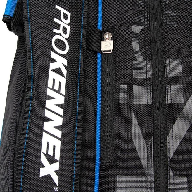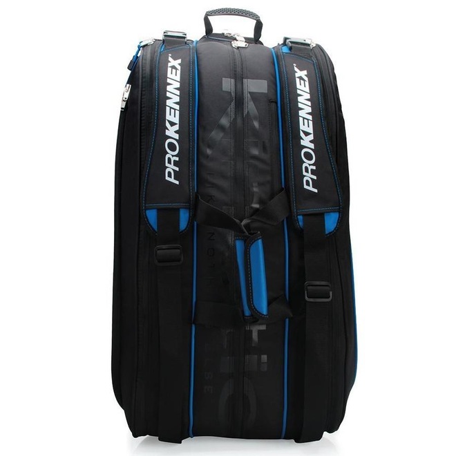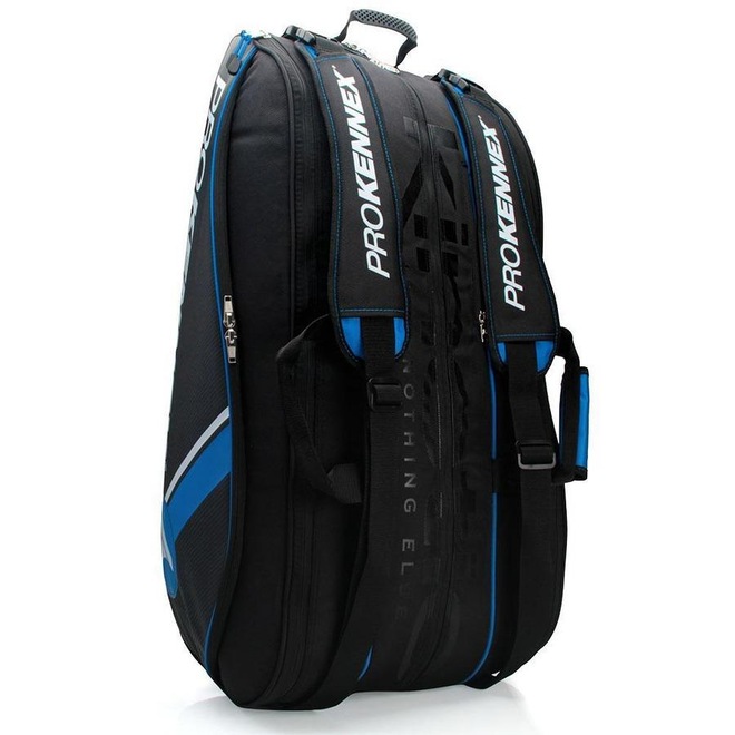 Descrição da Raqueteira Prokennex X12 2021 Preta e Azul A Prokennex foi pioneira no desenvolvimento de raquetes de Tênis, Squash, Badminton e tacos de Golfe.Foi precursora na combinação de materiais, na fabricação desses materiais e inovou ao introduzir fibras de grafite na estrutura de madeira das tradicionais raquetes da década 70.