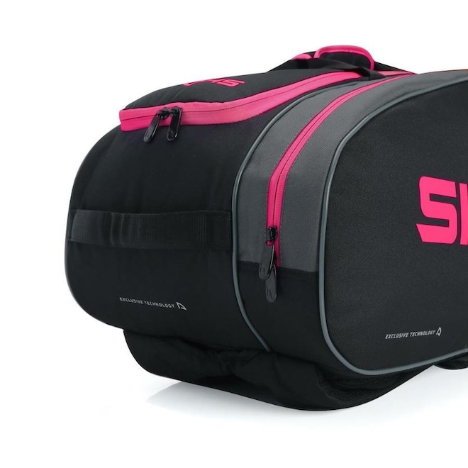 Ela pode acomodar até 9 raquetes de beach tennis ou 5 raquetes de padel, ambas sem capa, e possui um compartimento térmico.
