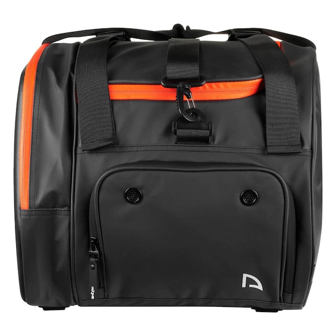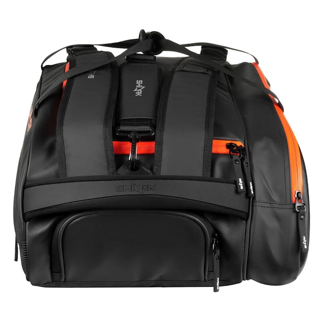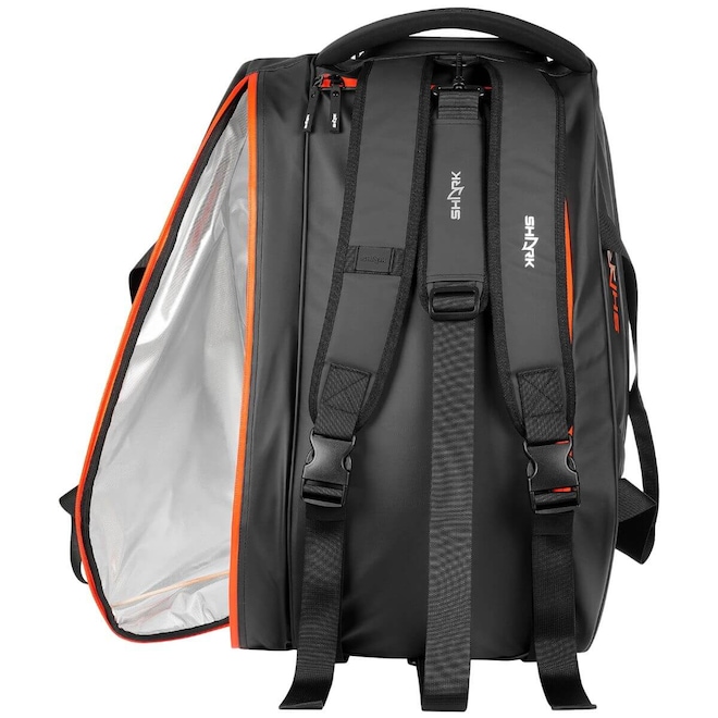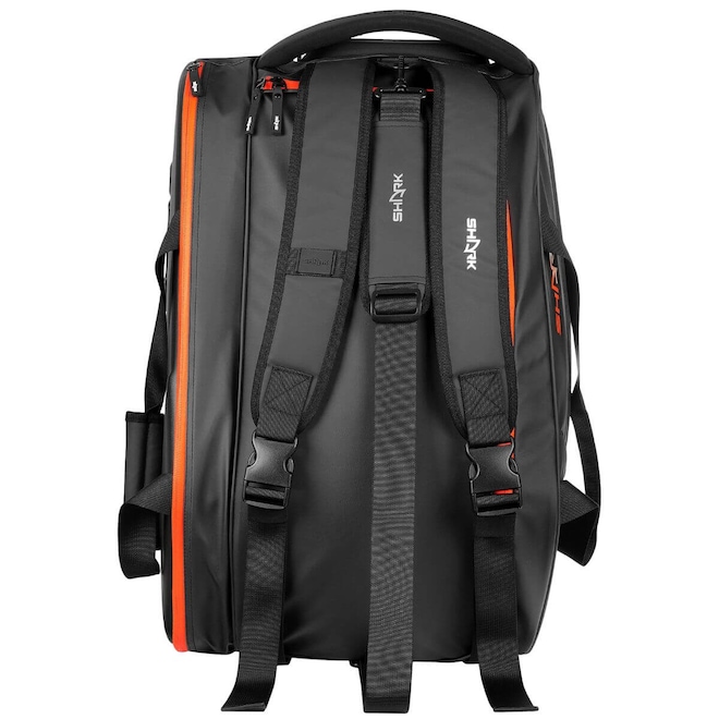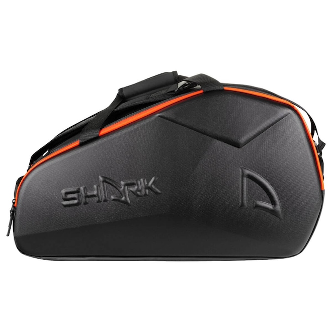 A Raqueteira Shark Beach Tennis, possui alça acolchoada para facilidade de transporte, divisórias laterais para acessórios e compartimento para calçados.