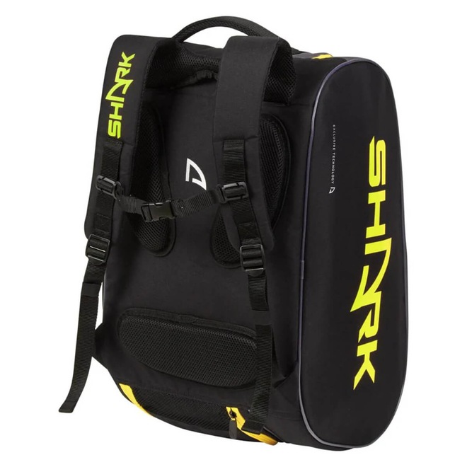 A Raqueteira Shark Beach Tennis, possui alça acolchoada para facilidade de transporte, divisórias laterais para acessórios e compartimento para calçados.