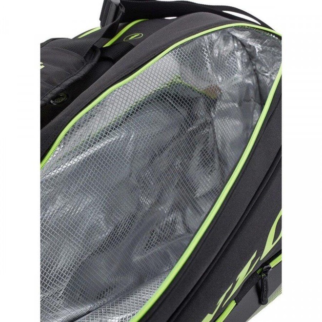 Com um exterior bonito, ela possuí 3 compartimentos principais para transportar muitos equipamentos - um deles possui revestimento de controle climático e suporta até 4 raquetes, um compartimento intermediário que pode ser usado para acomodar ou podem ser montada para criar compartimentos menores para tênis ou roupas, pois esta seção também possui ventilação o terceiro compartimento que comporta até 4 raquetes.