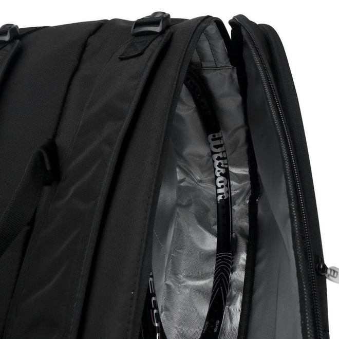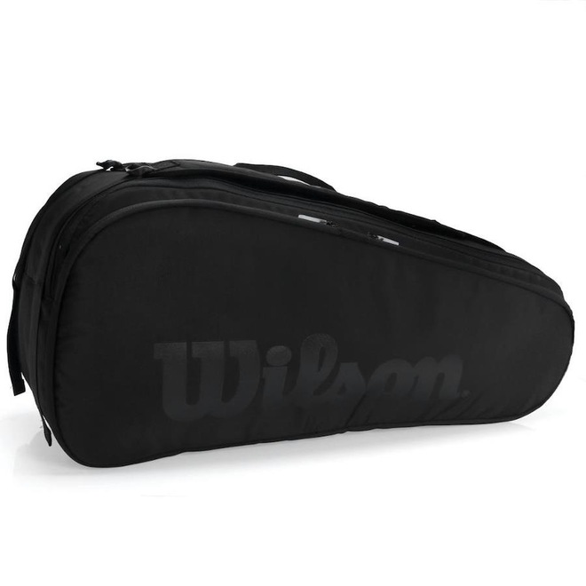 - Detalhamento: Raqueteira tripla, comporta até 12 raquetes sem capa, dois compartimentos principais com fechamento em zíper, técnologia térmica em um dos compartimentos para proteger seus equipamentos contra a temperatura externa, bolsos nas laterais com dívisória central para maior organização de seus pertences, compartimento para transporte de um par de calçados ou roupas úmidas. Duas alças reguláveis para ser transportada nos ombros e alças de mão no centro e extremidade para maiores opções de transporte. Escrita Wilson nas duas faces da peça;