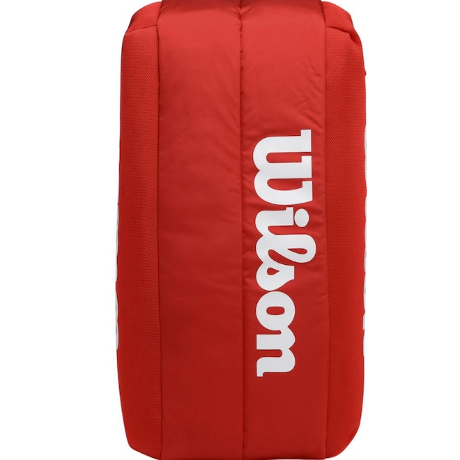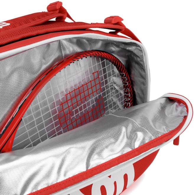 - Detalhamento: Raqueteira dupla, comporta até nove raquetes sem capa, dois compartimentos principais com fechamento em zíper, um compartimento foi desenvolvido com tecnologia térmica para proteger seu equipamento da temperatura externa. Dois bolsos laterais, cada um com compartimentos telados e fechamento em zíper, proporcionando uma organização mais eficiente dos objetos, Também conta com um pequeno bolso lateral para objetos pequenos, duas alças reguláveis para ser transportada nos ombros. Escrita Wilson em ambas as faces, e na parte inferior da peça;