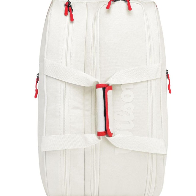 - Detalhamento: Raqueteira dupla com quatro compartimentos e fechamento em zíper, sendo capaz de acomodar até 4 raquetes sem capa. Um dos compartimentos possui organizadores. Dois bolsos laterais oferecem espaço extra para pequenos objetos. As alças de mochila acolchoadas e ajustáveis garantem um transporte confortável, enquanto a alça de transporte superior facilita o manuseio quando você preferir carregar a bolsa de forma rápida e prática. A escrita Wilson em ambas as laterais adiciona um toque de estilo.;