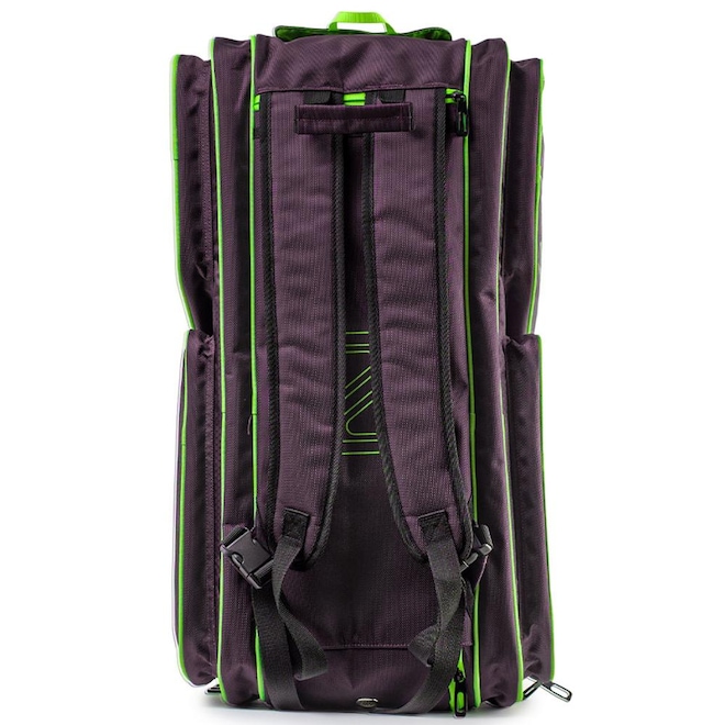 Compartimento central amplo, perfeito para roupas e equipamentos, com capacidade para até 09 raquetes sem capa, além de dois compartimentos laterais com forro térmico, ideais para proteger suas raquetes. Dois bolsos adicionais, em cada lateral, para acessórios e itens pessoais de rápido acesso. Espaço exclusivo para calçados, garantindo praticidade e higiene. Escrita ZEIQ em ambas as laterais e assinada pela atleta Rafa Miller. Alças reguláveis para levar nas costas e alças menores para transportar na mão;