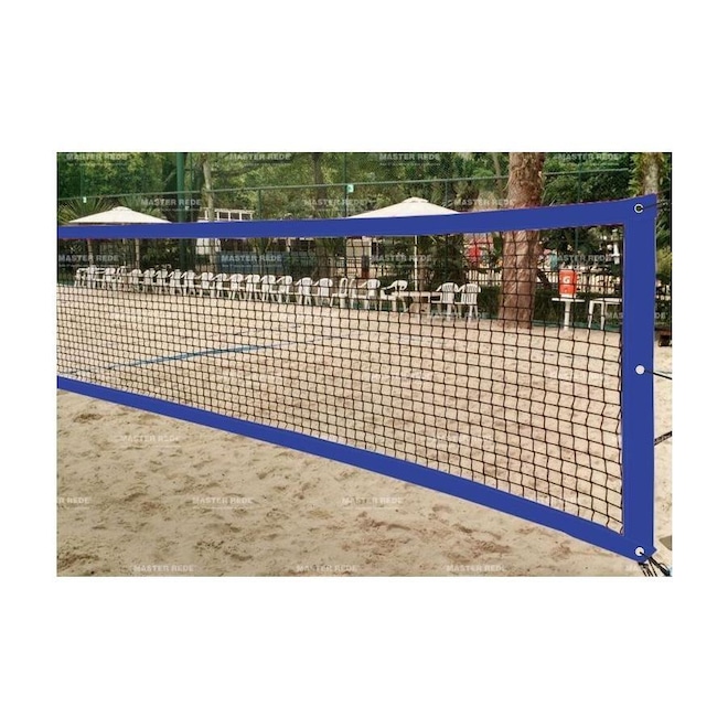 A Rede Beach Tennis Oficial com 4 faixas Azul fio 1,5mm Seda em preto marca Master Rede, tem suas faixas de 6cm fabricadas em nylon poliéster fixada a rede com costura dupla, possui rebite de latão de acabamento niquelado (antiferrugem) nas 4 pontas da rede para reforçar a costura das faixas, além disso tem uma corda de 6mm (PP) por dentro da faixa superior e inferior que é utilizada para a amarração junto aos postes e sustentação da rede, com proteção UV (protege contra ação dos raios solares, evita o apodrecimento dos fios e desbotamento da faixa).