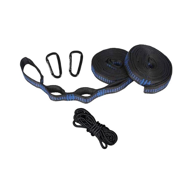 ela acompanha além da rede, 2 mosquetões, fita para ajuste e uma corda para amarração.