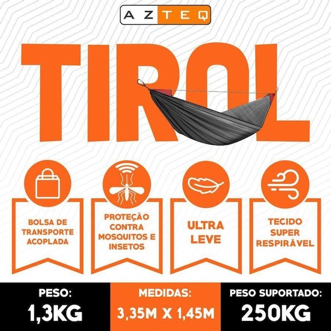 Fabricada em Nylon Ripstop, a Tirol é uma rede super resistente e durável, com peso suportado de até 250kg.