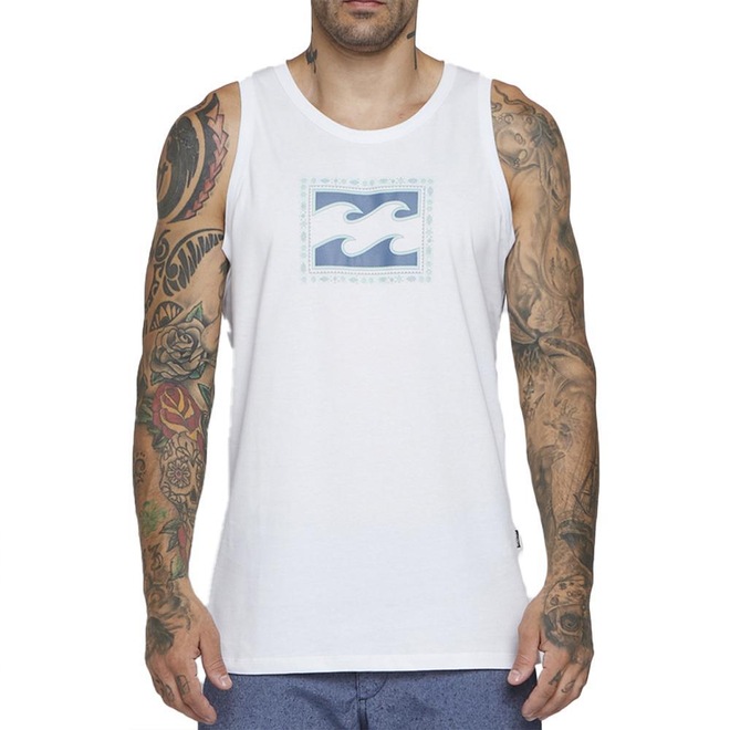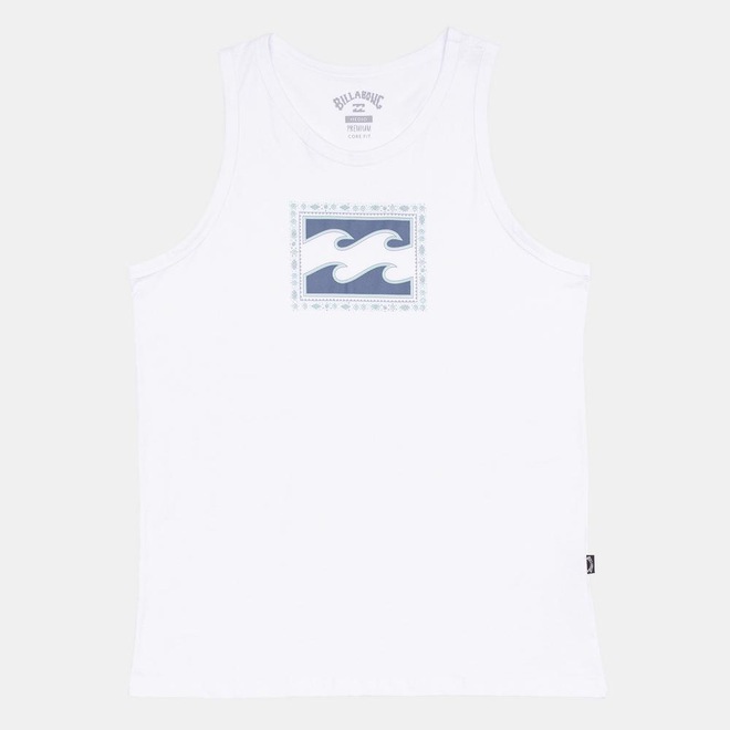Regata Billabong feita em meia malha penteada de algodão fio 30.1, modelagem core fit, estampa aplicada no peito e etiqueta personalizada.