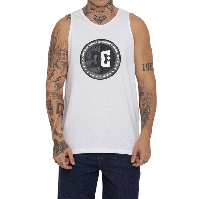 Regata DC Shoes com modelagem regular, malha penteada fio 30/1 e silk frontal.