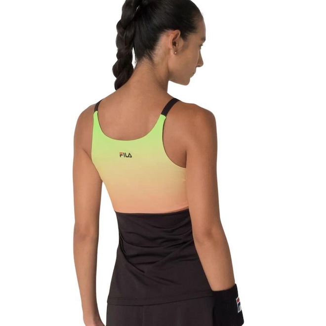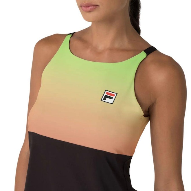 Regata feminina confeccionada em tecido de poliéster com elastano. Modelagem acinturada com recorte superior mais justo e recorte inferior mais solto para maior conforto durante as partidas. Produto ecológico com certificado Oeko-Tex, que testifica o não uso de químicos nocivos na sua fabricação. Seu tecido contém as tecnologias FLOW, que oferece secagem rápida e mantém o corpo na temperatura ideal para a prática esportiva, e a UV PROTECTION, que fornece proteção solar FPS 50+ dos raios UVA e UVB. Possui alças de 1,5 cm no próprio tecido, gola arredondada frente e costas, recorte superior com arte degradê sublimada, patch F-Box em termo aplicado na parte frontal esquerda superior e logo Fila Letter em termo centralizado abaixo da gola nas costas.