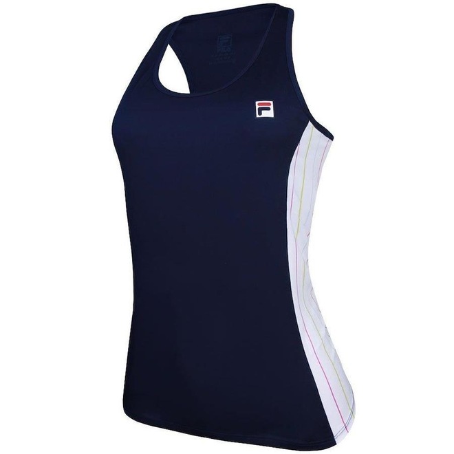 Seu design conta com recortes com listras coloridas nas laterais.   Principais características da Regata Fila Feminina Tank Top Core:Composição do Tecido: 96% Poliéster 4% ElastanoComposição do Forro: 91% Poliéster 9% ElastanoGola: RedondaManga: RegataLogo: Fila, estampado no lado esquerdoModelo: FemininoIndicado para: TreinoOrigem: Nacional