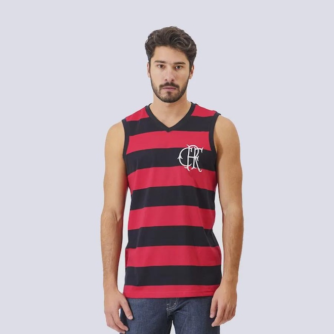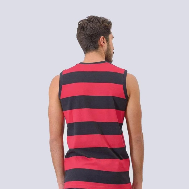 Regata retrô masculina confeccionada em malha listrada com fio tinto de algodão, que garante leveza, maciez e liberdade de movimento. Com modelagem machão e decote V, a peça traz o CRF bordado no peito, destacando a identidade rubro-negra em um visual clássico e cheio de estilo. Ideal para torcedores que valorizam tradição e conforto.