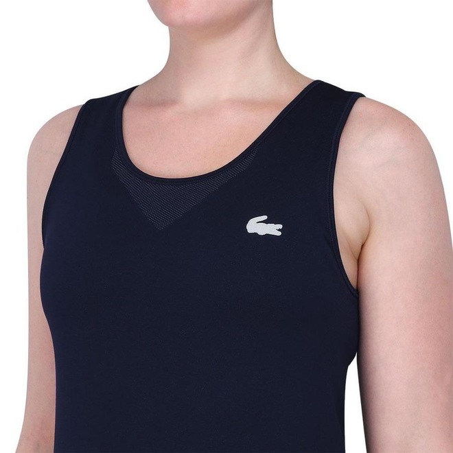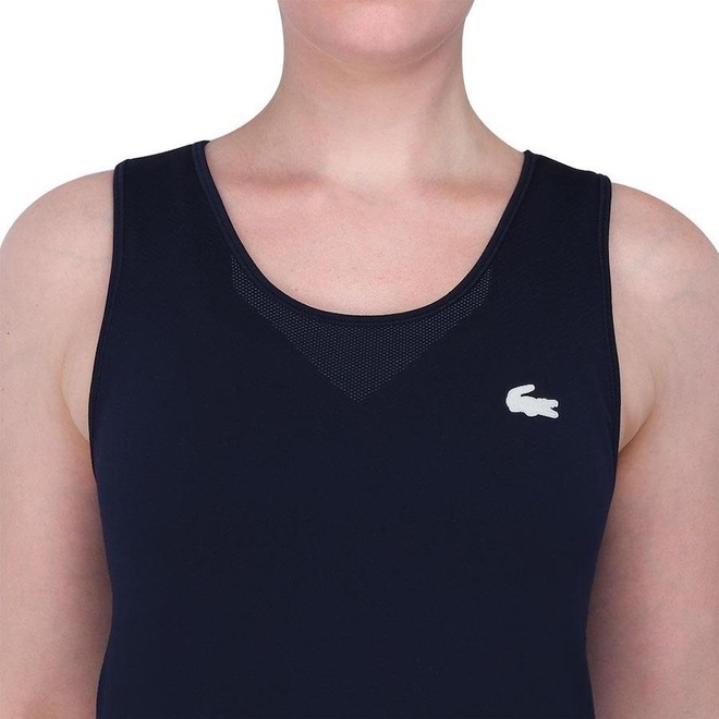 - Detalhamento: Regata com decote arredondado, alças largas, tecido elástico que absorver o suor e que possui um mix de tramas atribuindo à peça diferentes texturas, top sem bojo embutido, logo Lacoste emborrachado aplicado na altura do peito do lado esquerdo, escrita Lacoste centralizada na vertical no meia das costas e modelagem justa