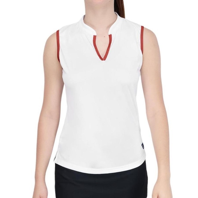 - Detalhamento: Regata, gola alta estilo Henley, sem botões, com uma abertura em V. Acabamento nas golas e ombros que se destaca pela cor contrastante, logo Wilson na altura da barra do lado esquerdo, aberturas de 0,06 cm nas laterais da barra proporcionando liberdade dos movimentos;