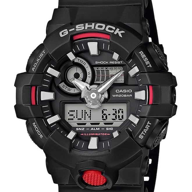 Conheça o Relógio Casio G-SHOCK Analógico-Digital GA-700-1ADR, um modelo que continua a tradição da marca de definir novos padrões em resistência e design. Este G-SHOCK original se destaca pela combinação analógica-digital, com ponteiros multidimensionais que dão a impressão de terem sido esculpidos em metal, criando um visual poderoso e arrojado. O design inovador não apenas aprimora a leitura, mas também transmite uma sensação de solidez inabalável. O botão frontal, posicionado estrategicamente às 6 horas, complementa o estilo dinâmico e vanguardista deste relógio robusto.