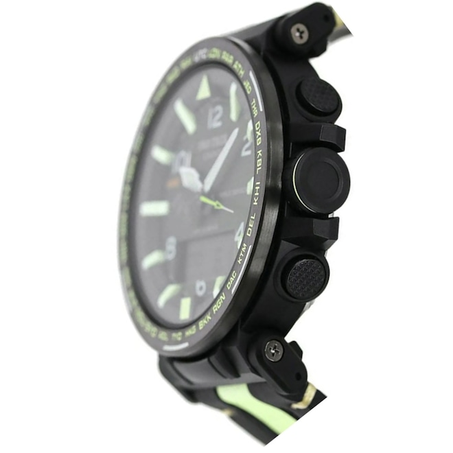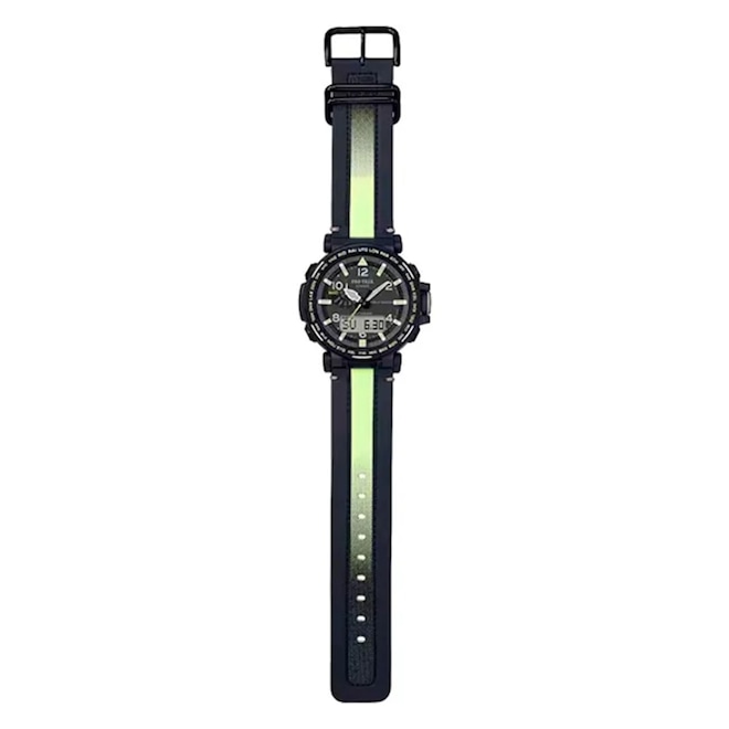 Um modelo temático de espeleologia (exploração de cavernas) da PRO TREK. Um preto profundo que evoca a escuridão negra das cavernas forma a cor base do relógio, enquanto laranjas e amarelos que lembram trajes de espeleologia são usados ??em todos os lugares para realces de cor. Além disso, uma pulseira de couro fosforescente é usada junto com um material fosforescente usado como preenchimento de cor para os índices e aro, fazendo o relógio brilhar no escuro. Isso aumenta a visibilidade à noite.