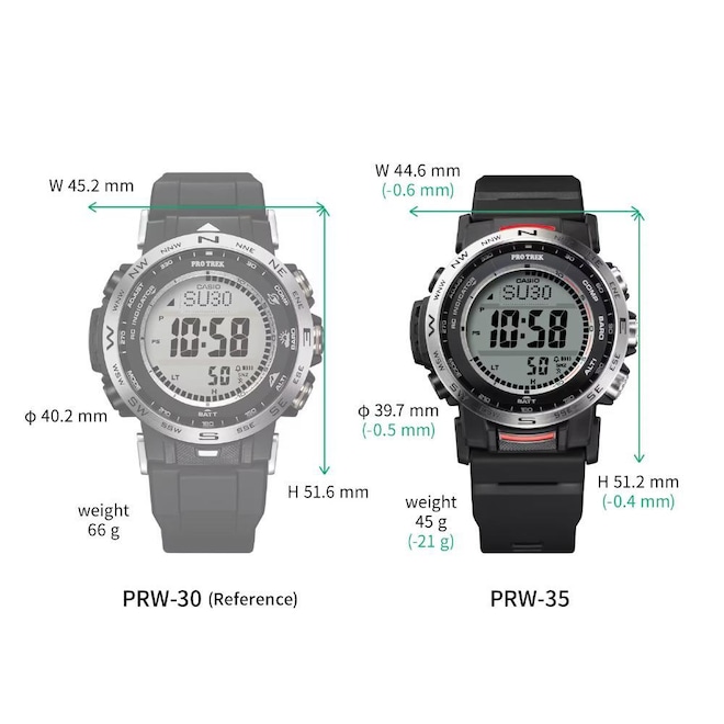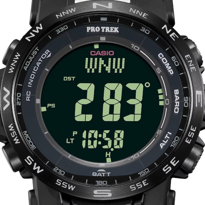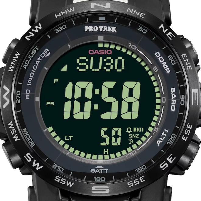 Esse relógio realmente oferece um pacote completo: funcionalidade externa conveniente com um toque em um relógio que incorpora materiais que devem ajudar a reduzir o impacto ambiental. Satisfaça sua paixão pelo ar livre e seu amor ao meio ambiente com o PRW-35 digital.