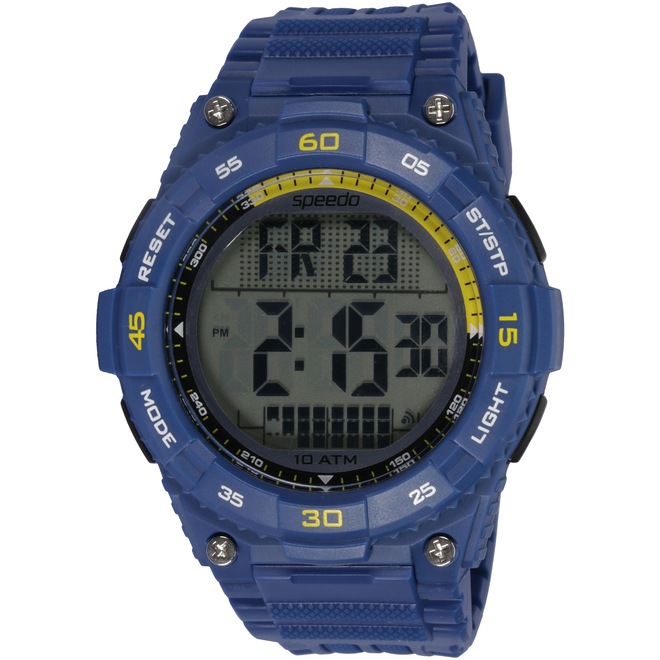 Mecanismo Digital Gênero Masculino Material da Pulseira Borracha Material da Caixa Borracha Tipo de Fecho Tipo 1 - Fecho simples Duração da Bateria Aproximadamente 2 Anos Dual Time Sim Cor do Visor Claro Resistência à Água 10ATM ou 100 M - Pode ser usado na prática de esportes marítimos. Não utilizar no mergulho técnico. Alarme Sim Exibição da Data Sim Cronógrafo Sim Iluminação Noturna Sim Garantia do Fornecedor Contra Defeito de Fabricação Conteúdo da Embalagem 1 Relógio SAC do Fornecedor SPEEDO: atendimento.cliente@seculus.com.br