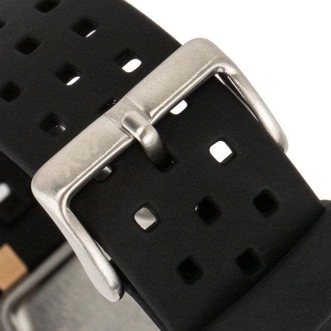 Possui mecanismo digital, tem pulseira em silicone e caixa de policarbonato. Além disso, tem fecho simples e resistência à água de até 100 metros.