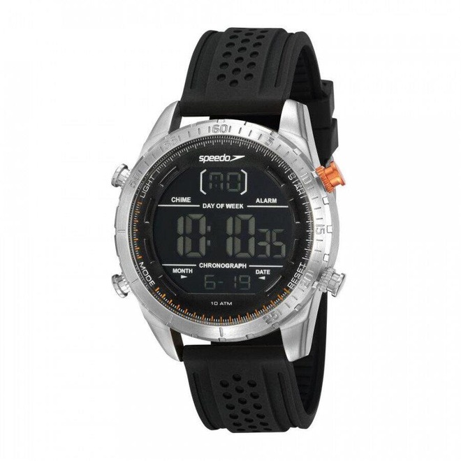 Relógio Speedo Digital com caixa prata e pulseira de silicone preto, com calendário, alarme, luz noturna e cronógrafo.