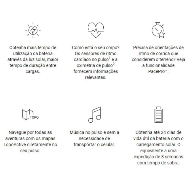 Sendo o nosso primeiro relógio a utilizar carregamento solar, o Fênix 6X Pro Solar não limita a distância que pode percorrer. A lente Power Glass? 1.4 utiliza a luz solar para aumentar a vida útil da bateria para aventuras prolongadas no exterior. O design robusto e sofisticado, inclui uma tela grande de 1.4? (36% maior do que a tela dos modelos Fênix anteriores). É testado em conformidade com as normas militares dos EUA relativas à resistência térmica, a impactos e à água. Adapte a aparência ao seu estilo de vida, adicionando uma variedade de opções de braceletes QuickFit ao re exclusivo em titânio ou titânio revestido a DLC em cinzento carbono. A duração de até 14/16 dias de bateria com energia solar no modo Smartwatch. Modo de relógio com economia de bateria até 48 dias/80 dias com energia solar e até 36 horas/40 horas no modo GPS. Compatibilidade com Smartphone: iPhone® e Android?. Armazenamento: 32GB. Resistência à água: 10 ATM. Dimensões: 47 x 47 x 15,1 mm. Resolução de vídeo: 260 x 260 pixels. Adapta-se a pulsos com a circunferência de 125-208 mm. Peso Aço: 85 g (somente estojo: 62 g).