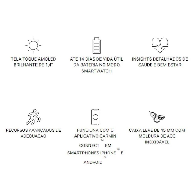 Desenvolvido especificamente com recursos avançados de saúde e condicionamento físico e a capacidade de fazer chamadas e enviar mensagens de texto o Venu 3 é mais do que apenas um smartwatch é o seu treinador pessoal de pulso para apoiar todos os seus objetivos. Com até 14 dias de duração da bateria, o venu 3 é capaz de fornecer uma imagem mais completa da sua saúde. Economia de bateria Modo Smartwatch até 26 dias. Contém mais de 30 aplicativos esportivos, treinos animados e garmin coach, treine de maneira objetiva e eficaz. receba e faça chamadas no seu pulso. Construído para a forma como você se move, o venu 3 pode monitorar impulsos e oferece exercícios integrados projetados para usuários de cadeiras de rodas e possui muito mais outros beneficios ideal para o seu dia a dia. Compatibilidade com Smartphone: iPhone® e Android?. Armazenamento: 8GB. Resistência à água: 5 ATM. Dimensões: 45 x 45 x 12 mm. Adapta-se a pulsos com circunferência de 135-200 mm. Tamanho visor: 1,4" (35,4 mm) de diâmetro. Resolução de vídeo: 454 x 454 pixels. Peso: 47g.