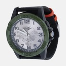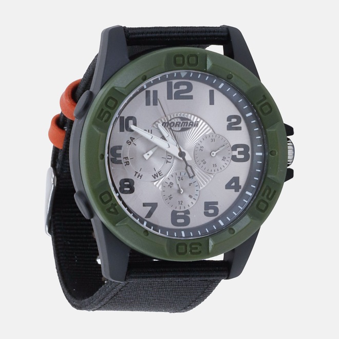 O modelo analógico apresenta aro texturizado, caixa robusta e mostrador com marcadores grandes para fácil leitura.