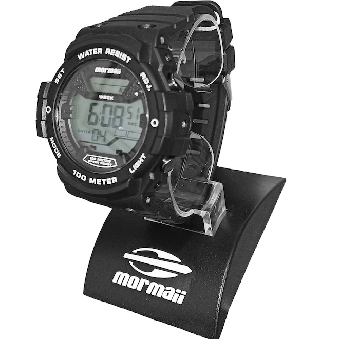 O Relógio digital Mormaii transmite um ar de sofisticação e personalidade alem de ser feito para pratica de esportes. Além do design elegante e esportivo, este modelo é feito com materiais de alta qualidade e possui uma resistência à água até 10ATM, além de proporcionar maior durabilidade. Estetica moderna, ideal para o dia-a-dia.
