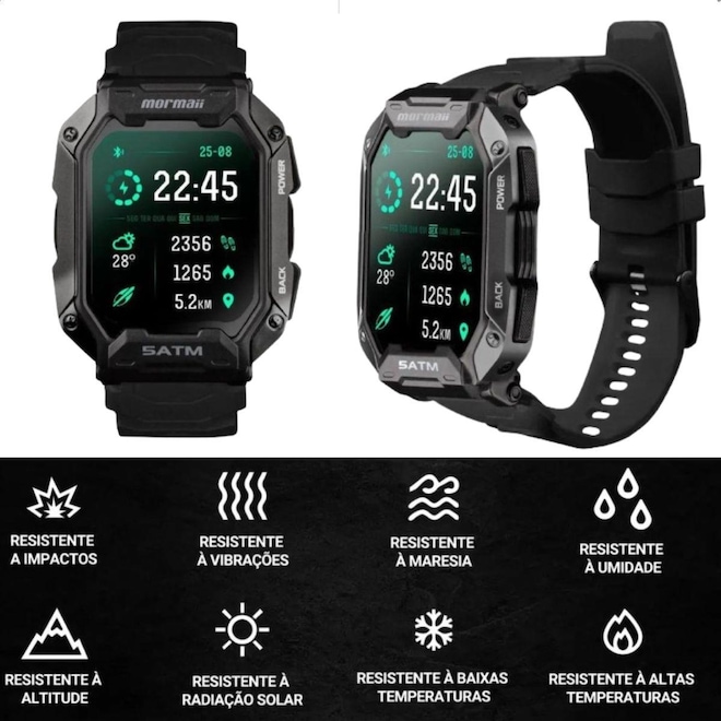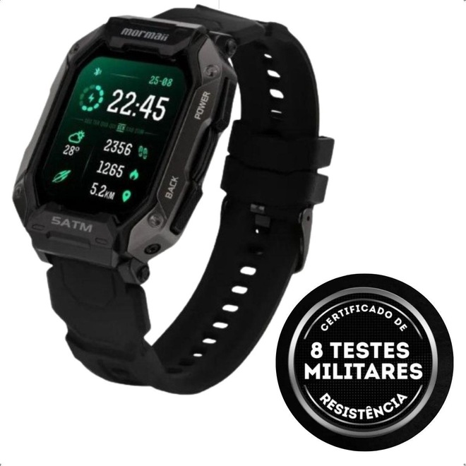 Descubra o poder do Smartwatch Mormaii Force, um smartwatch robusto e resistente, projetado para enfrentar condições extremas. Certificado militar MIL-STD 810H, ele é altamente resistente a impactos, vibrações, maresia, umidade, altitude, radiação solar e temperaturas extremas.