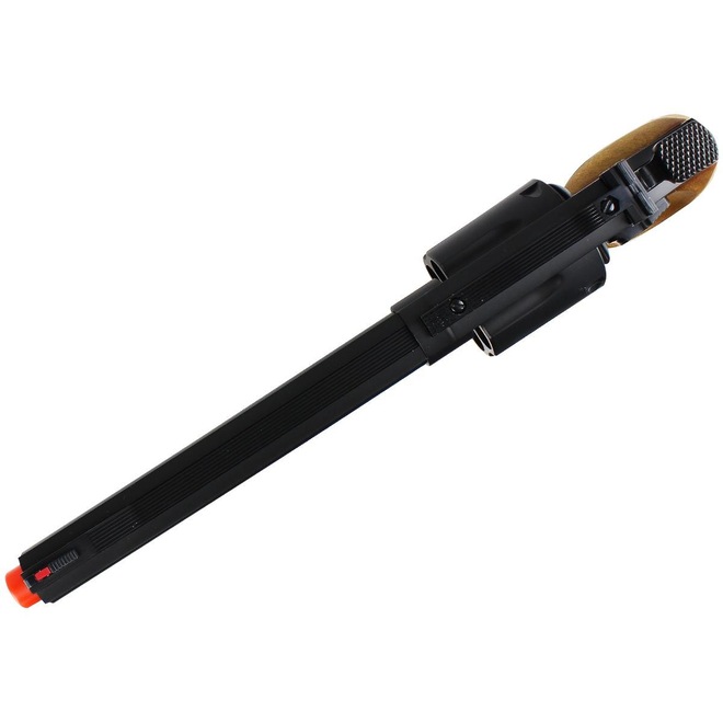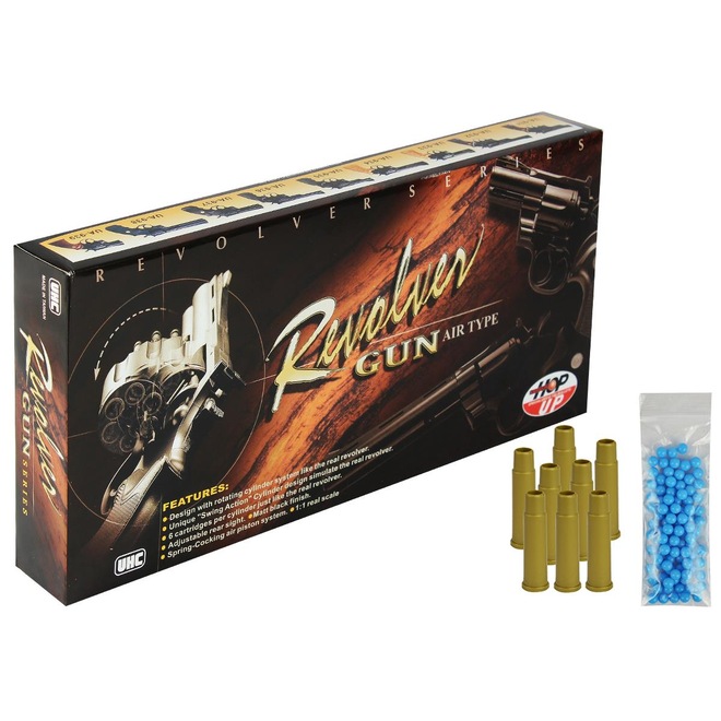 O Revólver modelo UA-934B tem ação Spring (por mola) e é confeccionado inteiramente em polímero. Seu desempenho em velocidade é de até 132fps (basicamente 40 metros por segundo) que é considerada média. Seu tambor de municiamento tem capacidade para 6 simulacros de projétil, sendo que para cada um é comportado somente 1 BB's. Seu sistema de armar funciona pelo engatilhamento do ''cão'' que fixa na parte inferior do revólver, contando ainda com o exclusivo Sistema de ajuste Hop-Up (que é, basicamente, quando a a trajetória da munição, através da utilização de uma pequena borracha ajustável na zona de entrada da BB's dentro do cano, causa um efeito de fricção provocando o backspin (rolamento inverso), fazendo com que a munição vença a gravidade e resistência do ar no seu percurso. Com este efeito é possível controlar o eixo vertical do disparo, atingindo alvos mais distantes e melhorando seu desempenho significativamente). Ideal para praticantes de Airsoft que procuram produtos diferenciados, ou até colecionadores que buscam produtos exclusivos, nesse modelo você econtrará todo o cuidado e perfeição do cabamento que a fabricante UHC tem, em uma réplica perfeita à um revólver de verdade!