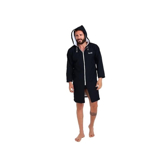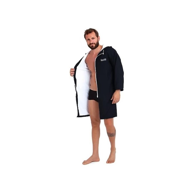 Roupão Best Fit adulto, desenvolvido para praticantes de atividades ligadas à natação. Modelo confortável, comprido e com bolsos laterais. O roupão com capuz possui ajuste de cordão, forro atoalhado e fechamento em zíper. Facilidade de manutenção, excelente absorção e secagem eficaz em um roupão adulto cheio de estilo! Benefícios: Conforto Secagem eficaz Excelente absorção Características: Facilidade de manutenção Rápida secagem Mangas longas Possui capuz Fechamento com zíper Composição: 100% Poliéster, 80% Algodão e 20% Poliéster IMAGENS MERAMENTE ILUSTRATIVAS.ref: M13H65