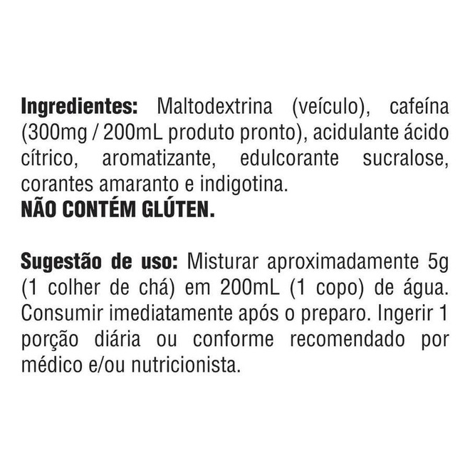 Ingredientes: Maltodextrina (veículo), cafeína (300mg/200mL produto pronto), acidulante ácido cítrico, aromatizante, edulcorante sucralose, corantes amaranto e indigotina.