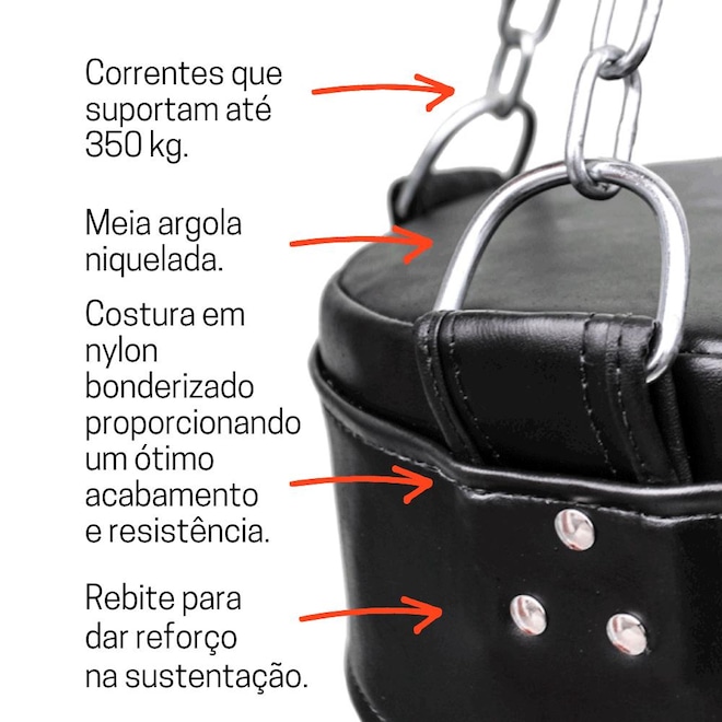Confeccionado em lona sintética de alta resistência, o saco de boxe possuí 175 cm de altura por 100 cm de circunferência (O tamanho total contando desde o fundo do produto até o término da alça fica em aproximadamente 195 cm de altura.).Quatro pontas de apoio reforçadas com dupla camada de PVC acompanhadas com argolas, correntes e um exclusivo sistema de mosquetão com trava, pronto para pendurá-lo! O saco de pancada é enviado VAZIO e possuí um zíper na parte superior facilitando o enchimento.