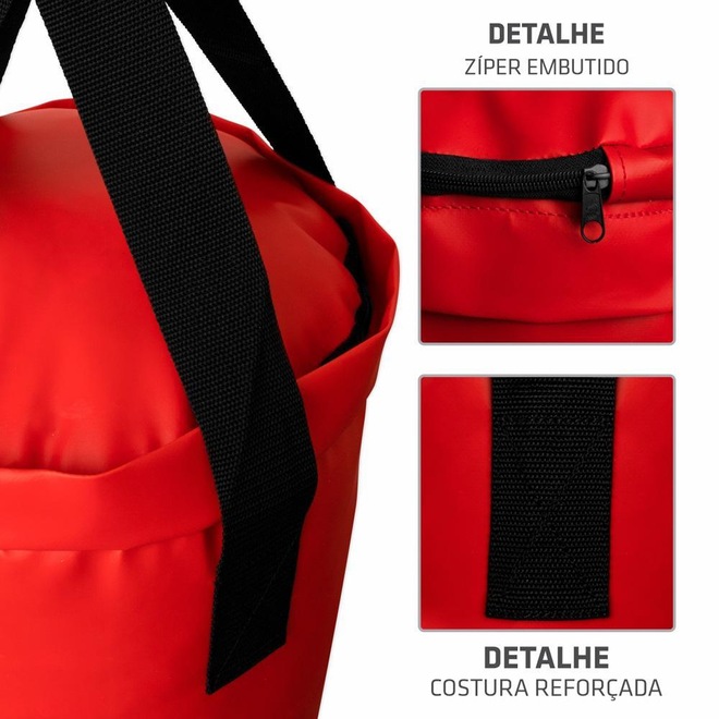 Comece a fechar o zíper da tampa do saco de pancada com cuidado, acomodando a sacola com material, até que feche por inteiro.