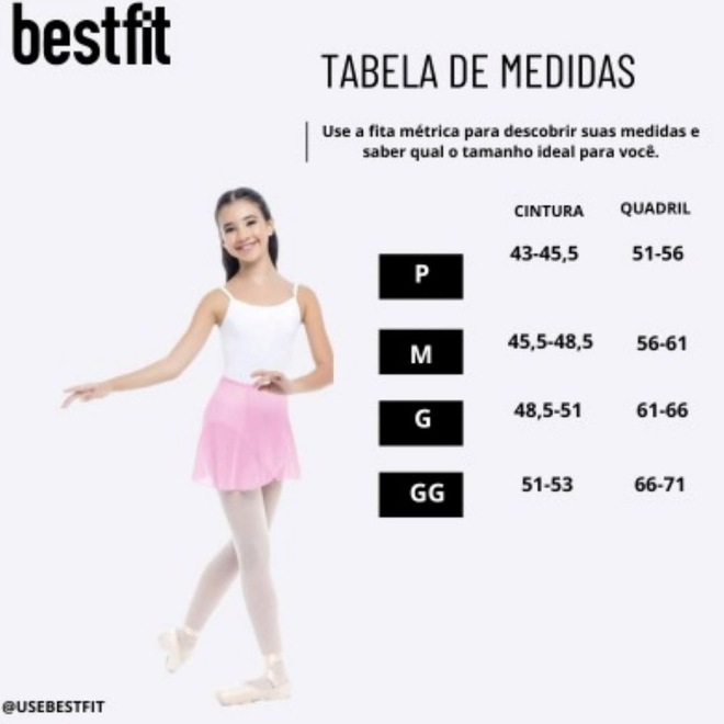 Saia Crepe Transpassada Só Dança, nada melhor que ter um traje confortável e que facilite a movimentação do corpo. A peça é execelente para ser usada com collant. Benefícios: Resistente ao uso Leve - Confortável Secagem rápida Tabela de Medidas: Tamanhos Busto Cintura Quadril Tronco P (2 anos) 45,5 a 51 43 a 45,5 51 a 56 86,5 a 94 M (4 e 6 anos) 51 a 56 45,5 a 48,5 56 a 61 94 a 102 G (8 e 10 anos) 56 a 63,5 48,5 a 51 61 a 66 102 a 109,5 GG (12 anos) 63,5 a 70 51 a 53 66 a 71 109,5 a 114 Composição: 100% Poliester OBS: Acompanha apenas a saia. IMAGENS MERAMENTE ILUSTRATIVAS.