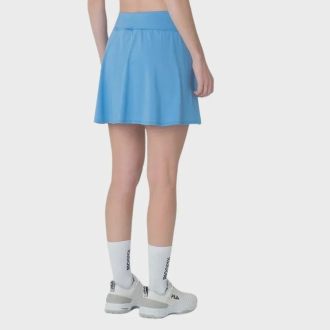 SAIA femininA confeccionado em tecido de poliéster com elastano na parte externa e shorts interno em malha de poliamida com elastano. Modelagem evasê com cintura média, transpasse frontal e comprimento curto. Produto ecológico com certificado Oeko-Tex, que testifica o não uso de químicos nocivos na sua fabricação. Seu tecido contém as tecnologias FLOW, que oferece secagem rápida e mantém o corpo na temperatura ideal para a prática esportiva, e a UV PROTECTION, que fornece proteção solar FPS 50+ dos raios UVA e UVB. Possui cós de 8 cm no próprio tecido com elástico interno, shorts interno com costuras Flat Seam (sem atrito com o corpo), vivos verticais contrastantes aplicados na parte frontal e patch F-Box em termo na parte frontal esquerda inferior. Comprimento total skort: 38 cm. Comprimento total shorts interno: 27 cm.