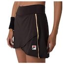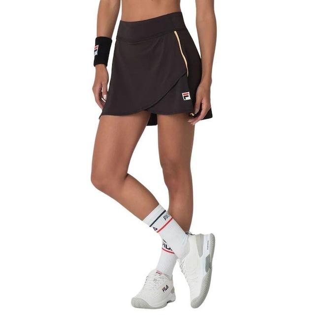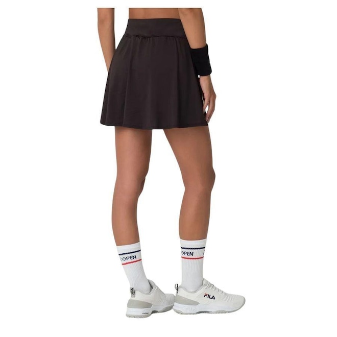 Skort feminino confeccionado em tecido de poliéster com elastano na parte externa e shorts interno em malha de poliamida com elastano. Modelagem evasê com cintura média, transpasse frontal e comprimento curto. Produto ecológico com certificado Oeko-Tex, que testifica o não uso de químicos nocivos na sua fabricação. Seu tecido contém as tecnologias FLOW, que oferece secagem rápida e mantém o corpo na temperatura ideal para a prática esportiva, e a UV PROTECTION, que fornece proteção solar FPS 50+ dos raios UVA e UVB. Possui cós de 8 cm no próprio tecido com elástico interno, shorts interno com costuras Flat Seam (sem atrito com o corpo), vivos verticais contrastantes aplicados na parte frontal e patch F-Box em termo na parte frontal esquerda inferior. Comprimento total skort: 38 cm. Comprimento total shorts interno: 27 cm.