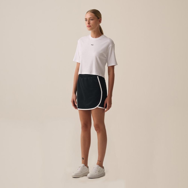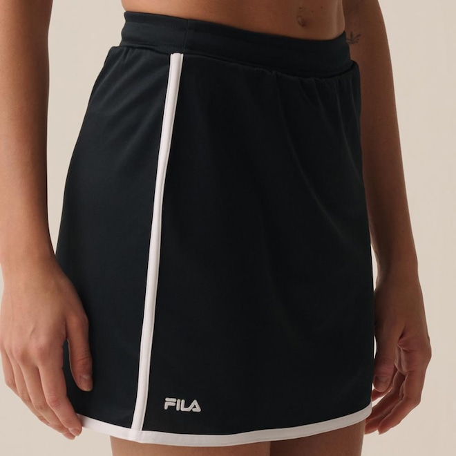 Saia envelope feminina confeccionada em malha sustentável de poliéster reciclado. Modelagem regular com cós elástico aplicado de 5 cm. Possui cordão de ajuste com amarração interna no cós, viés pespontado contrastante aplicado nas laterais e na barra e logo Fila Letter bordado na lateral direita próximo à barra. Comprimento total: 43 cm.