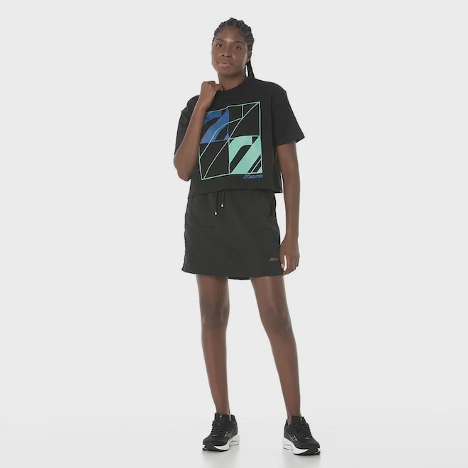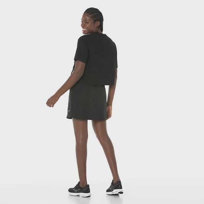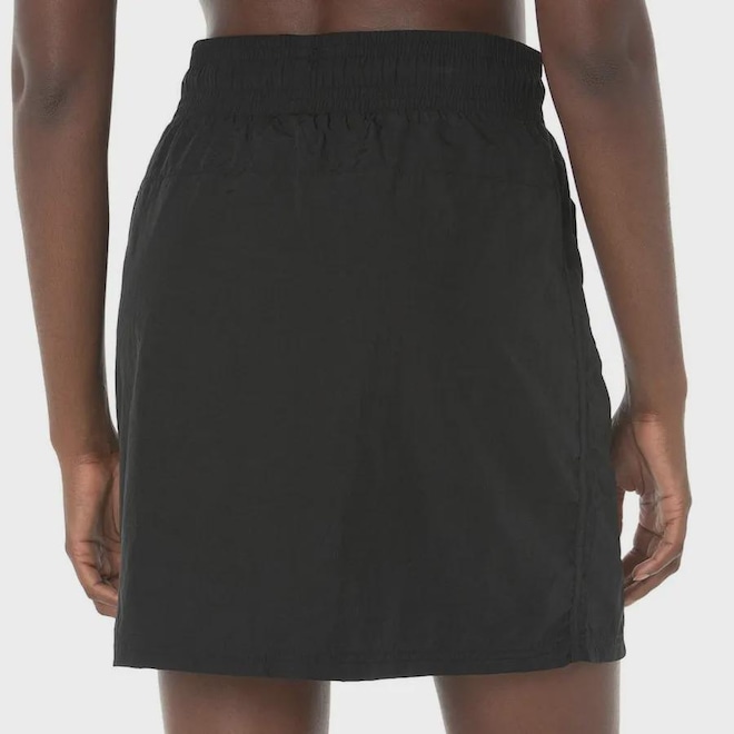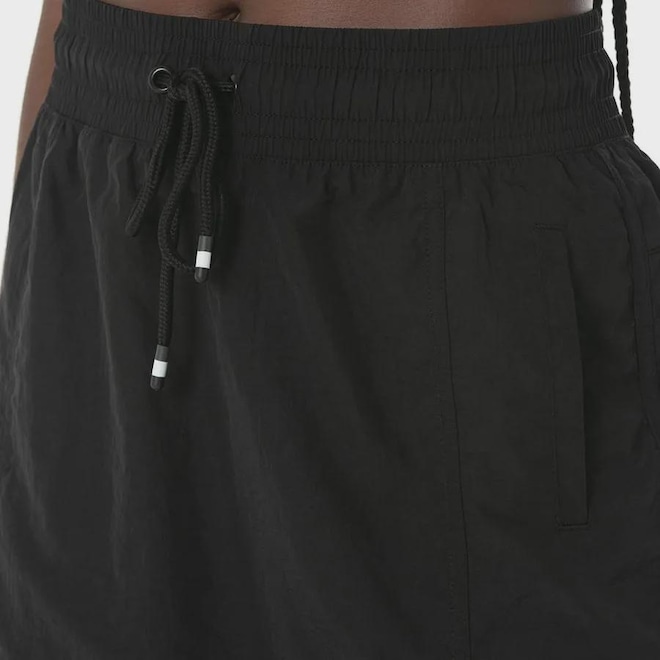 Saia em tecido plano de poliéster com mobilidade. Modelagem tradicional. Recortes retos. Cordão de ajuste do cós colorido. Bolsos frontais com fechamento em zíper invertido. Logo emborrachado.