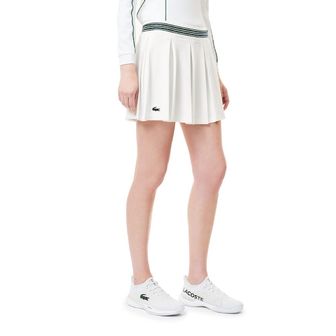 - Detalhamento: Saia plissada une o visual clássico do esporte com conforto técnico. Modelagem evasê com pregas largas. O design fluido garante liberdade de movimento, enquanto o cós elástico com listras coloridas dá um toque retrô e cheio de personalidade garantindo ajuste confortável e firme. Logo do crocodilo em silicone na frente. Shorts interno de leve compressão, ideal para para práticas esportivas como tênis ou padel;